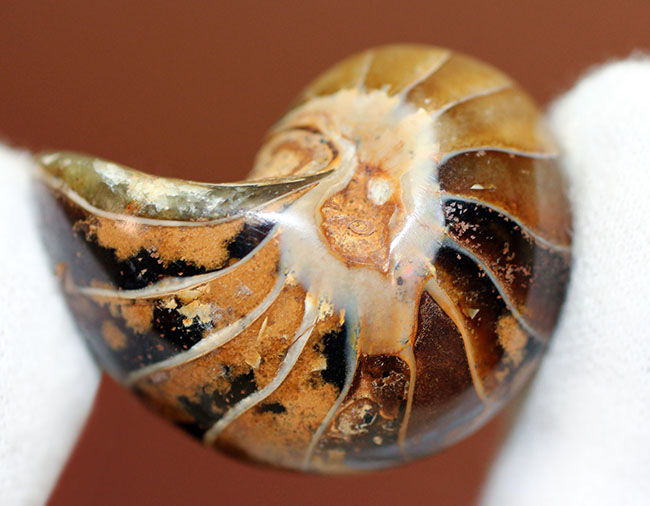 こちらの標本はいかにもオウムガイらしい特徴を備えており、外観も美しい。