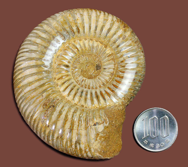 100円玉との比較。人気のアンモナイト、ペリスフィンクテスです。