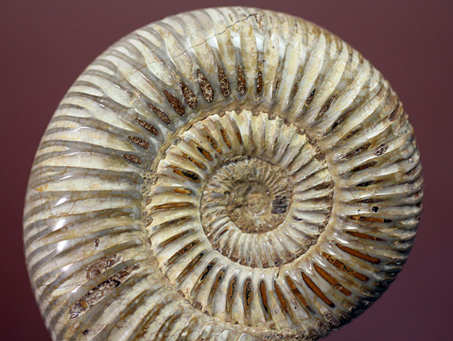外観の特徴としてはなんと言っても、非常にピッチの細かい肋(ろく)が挙げられます。肋(ろく)とは本来アバラ骨を表す言葉で、アンモナイトの殻に断続的刻まれた脈のことを指します。種によっては、ここまで細脈ではない個体もあるものの総じて、このような特徴があります。