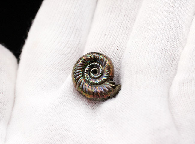 こちらはロシア産の遊色アンモナイト、アリガチセラスです。殻の表層部が虹色に輝きます。