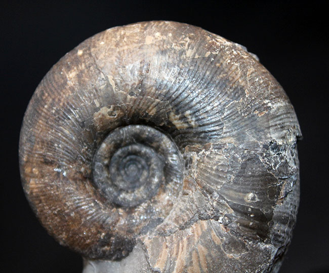 非常にピッチの狭い肋(ろく)。肋とは本来アバラ骨を表す言葉で、アンモナイトの殻に断続的刻まれた脈のことを指します。