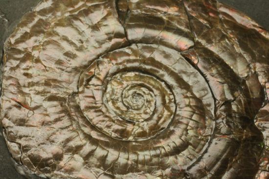 最も端の螺環(螺旋状に巻いた、アンモナイトの巻きの1巻き)のみ、派手に遊色しているのです。