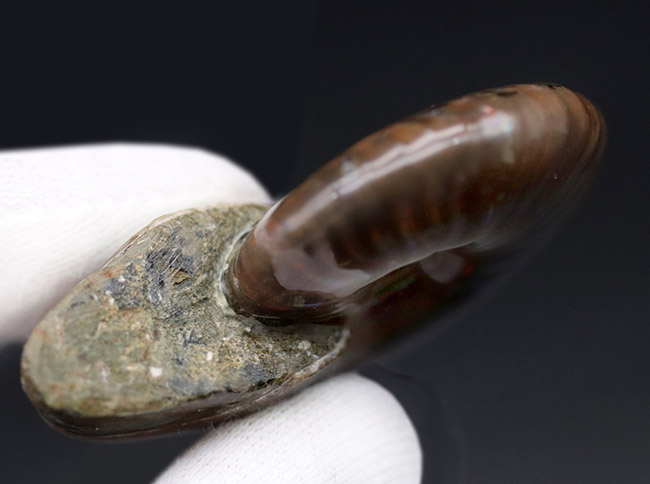 殻の表層にあるアラゴナイト層が傷つかずに保存されている証拠です。遊色アンモナイトの宝庫とされるマダガスカル産の標本でも、このような化石はめったにありません。