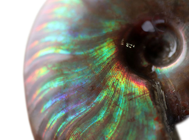 太陽光のもとで撮影すると、キラキラと輝きを増していきます。紫外線を含む光に当てるとより美しく輝きます。これは遊色するアンモナイトや鉱物全般に共通して言えることです。