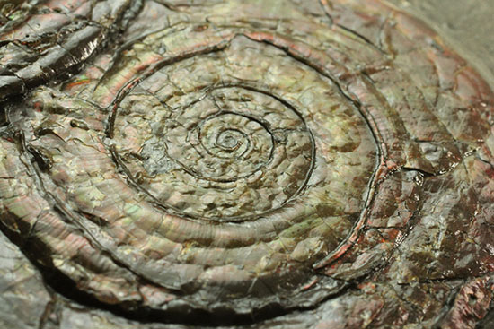緑とも赤とも臙脂ともいえない、これらが合わさったような色が醸しだされています。控えめながらも、その存在感を確かに主張する美しいアンモナイトです。