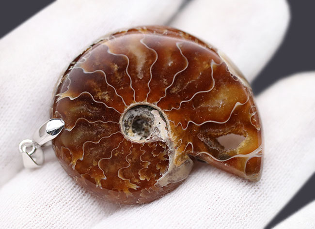 | 商品解説 | オンリーワン品、ハンドポリッシュによるデスモセラスアンモナイト化石のハーフカットペンダント、(高級ジュエリーケース、シルバーチェーン付き) |