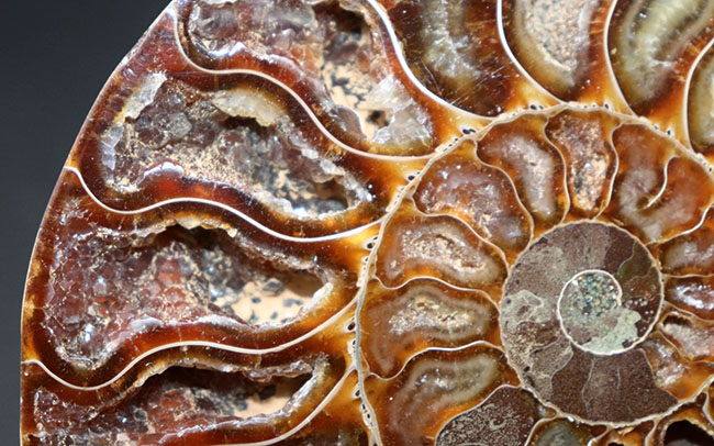 このように殻の内部をのぞける点が特徴です。アンモナイトの殻の内部は小部屋に分かれていて、開口部に向かって成長していきます。最も外側に軟体部が棲んでいました。ヤドカリなどとは異なり、軟体部と殻は一体化していて、一生をともにしました。詳しくはコラム「アンモナイトやオウムガイの内部はどうなっていたか?」を御覧ください。