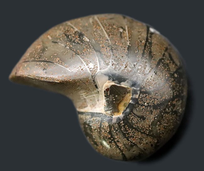 コラムのなかでも書いていますが、オウムガイは縫合線が隔壁が出口に対して凹んでいるのが、分かりやすい特徴です。こちらの標本でも同様の特徴が見てとれます。