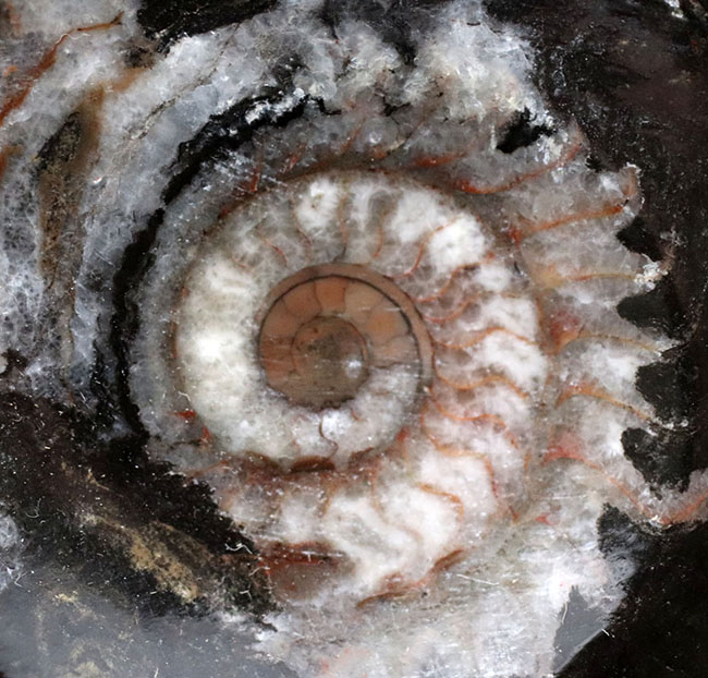こちらは古生代の頭足類、ゴニアタイトのマルチカラー標本です。黒、白に加えて茶の三色が見られます。