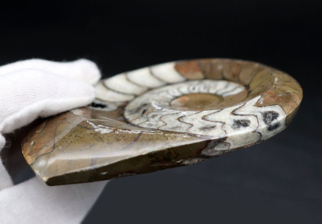 こちらは古生代の頭足類、ゴニアタイトの化石です。茶と白のツートン。ベーシックながら味わい深い。