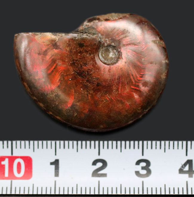 こちらは赤色を呈するマダガスカル産の遊色アンモナイト、クレオニセラスです。