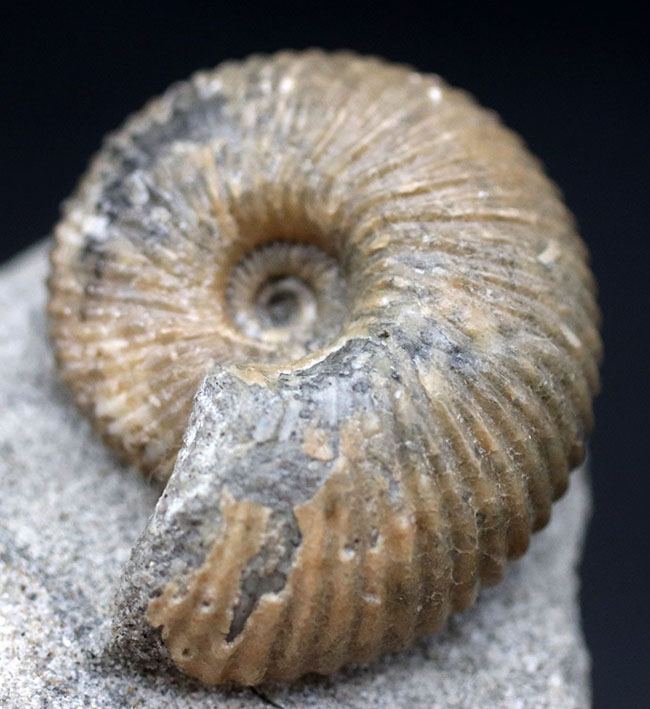 非常に細かい脈を持ち、比較的密巻きのアンモナイトです。あまり手に入らない珍しいもの。