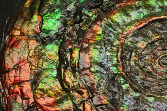 アンモナイトのような軟体動物の殻はアラゴナイトという結晶化されたミネラルによって作られていますが、このアラゴナイトは長い年月と圧縮を受けると徐々に方解石に変化していきます。カロセラス種は、この過程のちょうど真ん中にあり、アラゴナイト特有の非常にきらびやかな光沢に加え、方解石の特徴である複屈折を受け、人工では到底再現のできない不思議な色合いを発します。