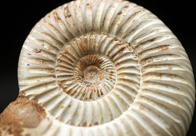 中央から縁部にかけて肋(ろく)が二股に分かれるのもペリスフィンクテスの特徴の一つです。肋(ろく)はアンモナイトの種類に固有で、同定(種類を特定)するときに役に立ちます。