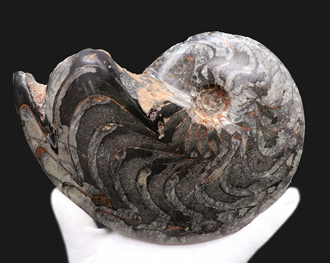 こちらは、極めて大きなゴニアタイトの完全体の化石です。ゴニアタイトの完全体は実は珍しく、ここまでのサイズとなると、なおさらレアです。なんと直径最大部186ミリ!通常、ゴニアタイトの場合、100ミリを超えれば大判と言って良い大きさですが、面積比で3倍以上、体積比で6倍以上の違いがあります。実際に手にとって比べると、確かにに5,6倍の違いを感じます。通常のゴニアタイトの大きさを知るコレクターなら、きっとあっけにとられる大きさです。
