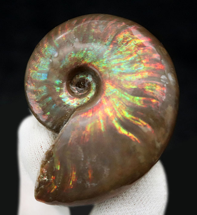殻の表層にある遊色層が保存されている場合に限り、このような美しいパターンが現れます。このメカニズムについてはコラム”光るアンモナイトはなぜ「光る」のか?”を御覧ください。