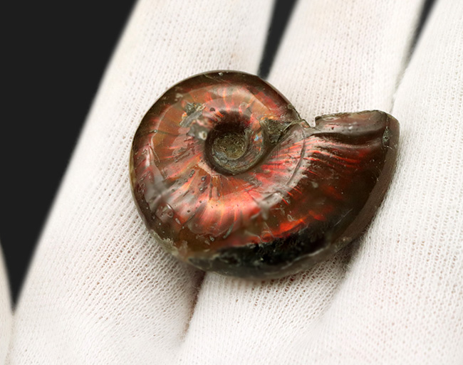 殻の表層に保存された遊色層に外光があたると干渉を起こし、ご覧のように美しい色を呈します。詳しいメカニズムはコラム”光るアンモナイトはなぜ「光る」のか?”をご確認ください。