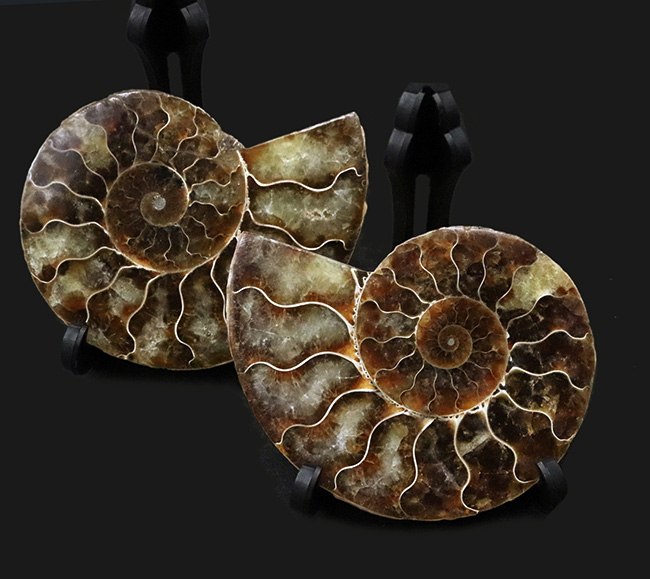- 色彩豊かでゴージャスな模様、明瞭な隔壁、丁寧に研磨された断面、遊色が残る表側など、コレクション品としてふさわしい特徴を備えたクレオニセラスのペア標本
