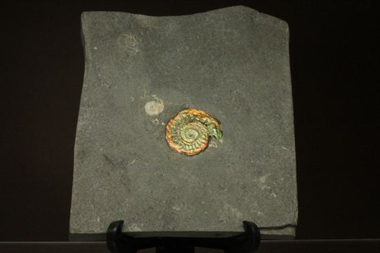光るアンモナイトで有名なのは、本標本のイギリス産カロセラスや、同じくイギリスのフィロセラス、そしてカナダアルバータ州産のアンモライトとよばれるものです。それぞれの標本が世界に2つとない色を表現することから、遊色アンモナイトファンはお気に入りの輝きを見つけて楽しんでいます。
