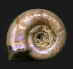 こちらの個体は、角度によっては希少色とされる紫が見られます。紫は可視光の中で最も波長が短く、干渉条件が限られるため、アンモナイトの遊色としては、とても珍しいカラーです。