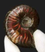 100円硬貨との比較です。深い赤色が際立つ、美しい遊色アンモナイト・クレオニセラス。厳選した上質標本です。
