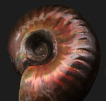 こちらはマダガスカル産の遊色アンモナイト、クレオニセラスです。遊色とは、殻表面に薄く残存したアラゴナイト層に光があたることで干渉が起こり、特定の色だけが反射する現象を指します。アラゴナイト層は堆積の過程で失われやすく、このように豊かな色彩を残した個体は決して多くありません。
