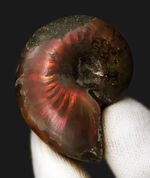 こちらはマダガスカル産の遊色アンモナイトです。数多くの標本の中から、特に発色が鮮やかな朱色をまとった個体だけを厳選しています。
