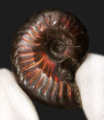 こちらは、今から約1億年前、白亜紀の海を泳いでいた「クレオニセラス」というアンモナイトです。マダガスカルの地層から産出するこの種は、保存状態が良い場合、殻の真珠層が残り、このように虹色の光(遊色)を放つのが最大の特徴です。この個体は、深みのある赤からオレンジにかけての炎のような輝きが際立ち、手に取って光にかざすと、角度によってキラキラと表情を変えます。