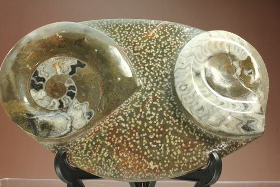 | 商品解説 | 美しい模様の母岩プレートに、2つのゴニアタイトがバランス良く配置された、クオリティの高い標本です。 特徴は、見事にポリッシュされた質のよい標本と、母岩の処理の美しさ。 10cmの標本はブラウンが、8.5cmの標本はホワイト中心の色が出ており、それぞれの模様が違った印象で味わえます。 ラウンド型で柔らかい雰囲気もあり、全体的に上品な印象のプレート化石です。 スタンドを用いて、立てて飾っても、平置きでもいずれも楽しめます。 |