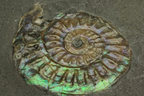 アンモナイトのような軟体動物の殻はアラゴナイトという結晶化されたミネラルによって作られていますが、このアラゴナイトは長い年月、圧縮を受けると徐々に方解石に変化していきます。虹色アンモナイトは、この過程のちょうど真ん中にあり、アラゴナイト特有の非常にきらびやかな光沢に加え、方解石の特徴である複屈折を受け、人工では到底再現のできない不思議な色合いを発します。