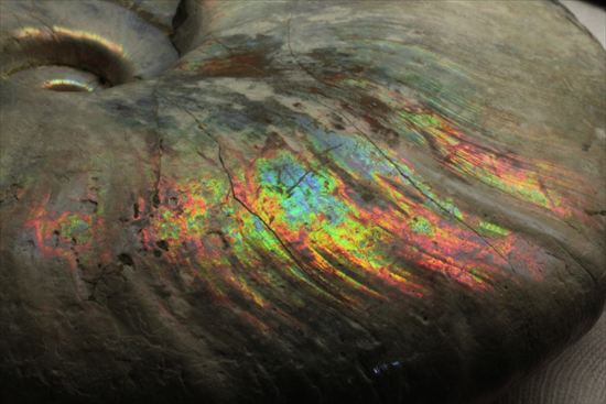 アンモナイト中で光るアンモナイトを「遊色アンモナイト」とよびます。これらはアンモナイト表面にアラゴナイトと呼ばれる層がくっついて化石化しています。アラゴナイトというのは鉱物の名前で、日本ではあられ石(霰石)ともいいます。主成分は炭酸カルシウムです。
