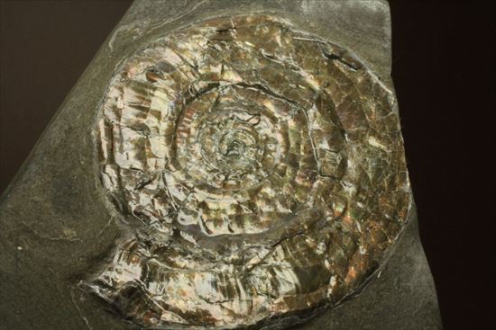 ご覧のとおり、光を当てますと、ピカピカと光り輝きます。このような現象を遊色(イリデッセンス)と言い、アンモナイトの種類が多いなか、珍しく、希少な標本です。