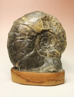 | 学名 | 一部黄鉄鉱化した、希少な北海道産アンモナイト。標本と一体化した土台付き。 |