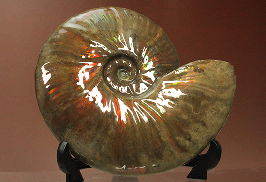 両面、イリデッセンス(iridescence)を有します。イリデッセンス(iridescence)とは、光の干渉(かんしょう)により、アンモナイトの殻が様々な色に輝く現象のことです。この現象の面白いところは、特定の角度で、このように美しく輝きを放つところです。イリデッセンス(iridescence)を遊色と言いますが、まさに、色が空間を自由に遊んでいるようです。角度を合わせて美しい光を見つけたときには、感動します。
