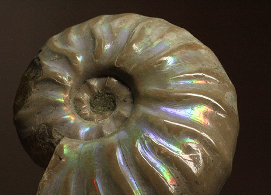 マダガスカル産のホワイトベースのアンモナイト。肋の流れに沿って、何ともファンタジックに虹色が輝きます。