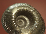 そもそも、なぜアンモナイトの殻がメタルに?という疑問をお持ちではないでしょうか。本標本は英国のオックスフォードクレイという現在では発掘されていない地域から掘り出されたものです。同産地はジュラ紀の地層から成ります。従ってアンモナイトが死に絶えたのは1億5千万年前前後と考えられます。類人猿が誕生した時期を仮に500万年前と考えても、おおよそ30倍もの悠久の時を経て、現在に至ります。膨大な時間をかけて黄鉄鉱が豊富な周辺環境から、徐々に本来の成分が置換され、このように金属の塊になったのです。