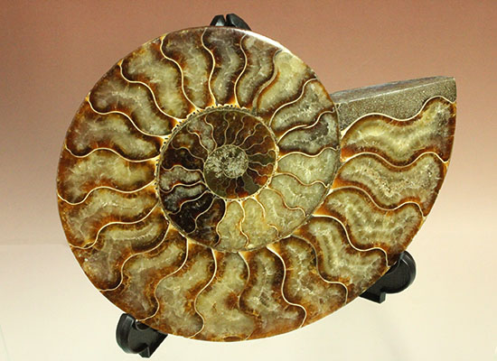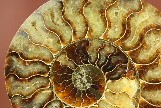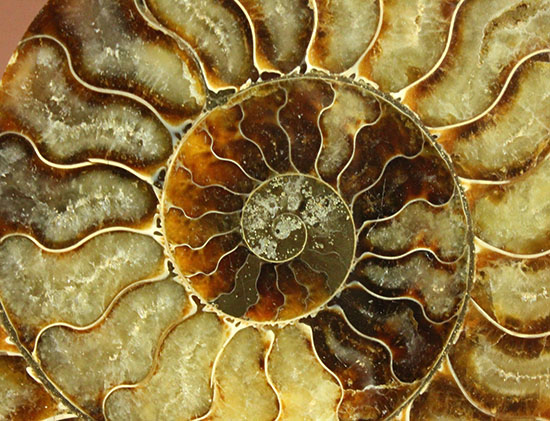 まるで絵描きが描いた曲線模様のようですが、これはアンモナイトの隔壁部と、周囲の堆積環境が生み出した自然のデザインです。何千万年もの解きを経て、頭足類の殻が飴色のブラウン色へと化石化したのです。なんとも壮大な計画です。