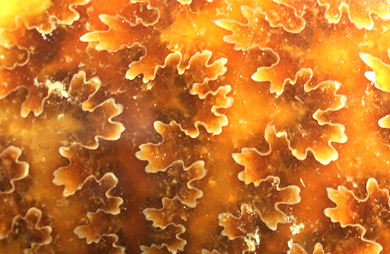 写真左上をご覧ください。光を透過しているのがお分かりいただけるでしょうか。この部分はメノウ化しており、飴色に輝きます。