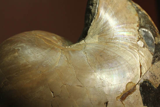 そして、最大のポイントはここです。シェルの最外殻が保存されているのです。よく見るオウムガイの肋(ろく)の部分のさらに外に若干のイリデッセンス(iridescence)を保持しつつ静かに球を包む層がお分かりでしょうか。巡検でこれを発見すれば、誰しもがこの状態を維持し続けようと考えるはずです。非常に希少な最外殻を保持しています。もちろん新たなるオーナーのポリシーでクリーニングを進めるのも良いでしょう。しかし個人的にはぜひこのままで維持して頂きたい。実に印象的な化石です。