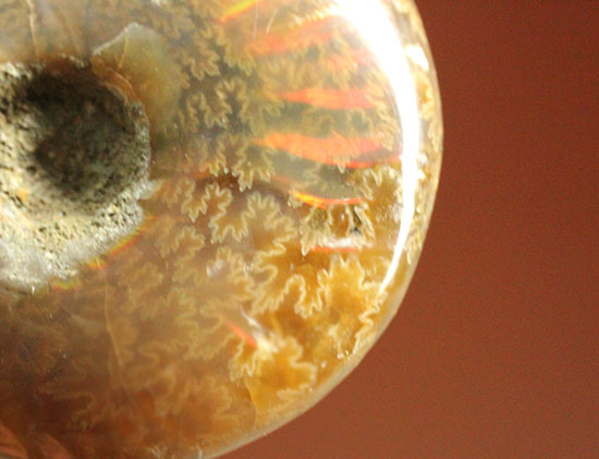 赤色を中心に、炎のように輝く、マダガスカル産アンモナイトをご紹介します。直径は3.8センチです。