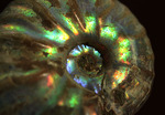 アンモナイトが光る現象は一般に、イリデッセンス(iridescence)と言われています。イリデッセンス(iridescence)は厚さが異なる薄い層が交互に重なっている多重構造によって現れます。殻の表面は、アラゴナイト層とキチン層が交互に何重にも形成されているのですが、一見層があるようには全く見えないので、標本を手にして、その幻想的な輝きを見ていると、本当に不思議な感覚になります。