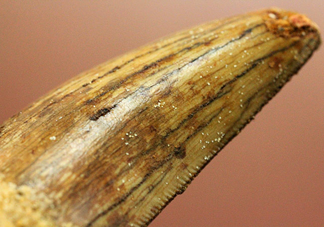 この歯化石にはセレーションが残されています。カルカロドントサウルスの歯化石の多くは、続成作用や風化により比較的傷んでいるものが多いため、セレーションが保存されている点は他の恐竜の歯化石以上に評価できるポイントになります。