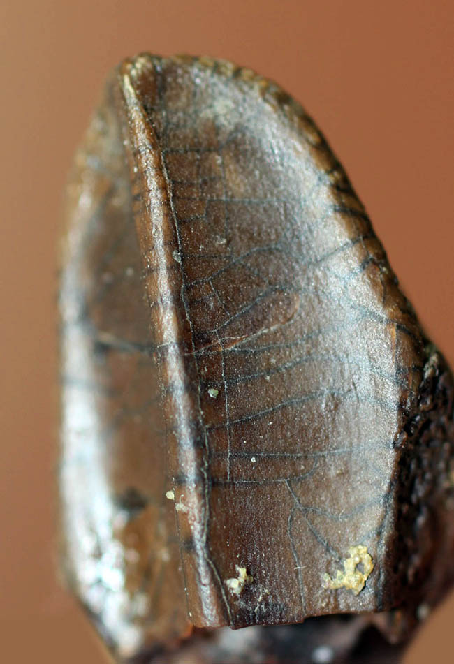 こちらの面は大部分のエナメル質が残されており、テクスチュアのパターンを楽しむことができます。トリケラトプスの歯化石の多くは、摩耗が広範囲に進行し、このようにパターンを拝める標本を希少です。