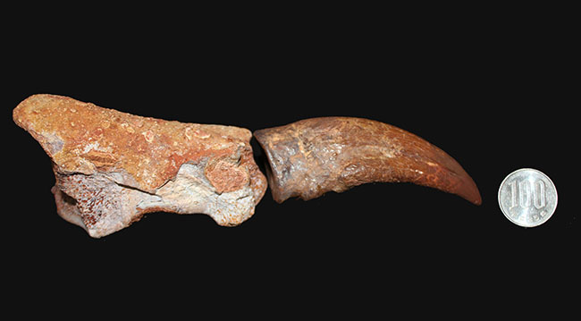 こちらの化石には爪だけでなく指骨の化石がついています。色が異なるのは、採集された場所が物理的に多少離れているためと考えられます(化石は骨が整然と並んだ状態で見つかるケースばかりではありません)。