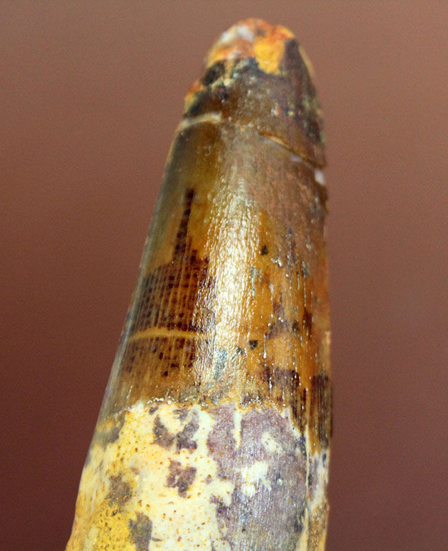 - いかにも典型的なスピノサウルス(Spinosaurus)の歯化石。史上最大級に成長したとされる肉食恐竜。