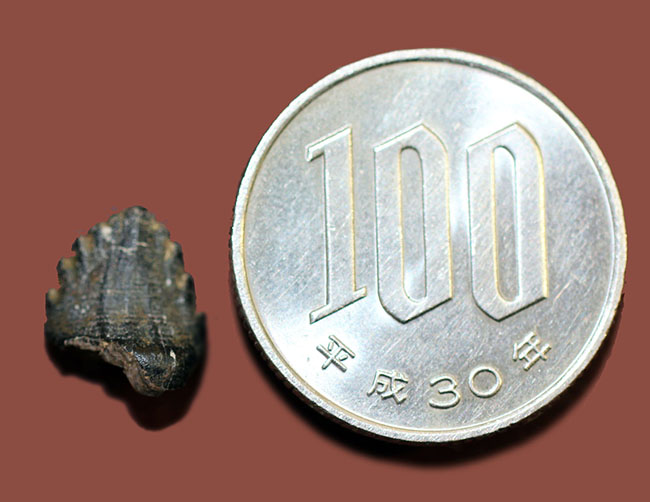100円玉と比較しても小さいアンキロサウルスの歯化石。非常に希少な存在です。