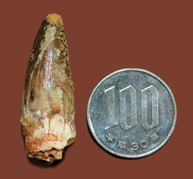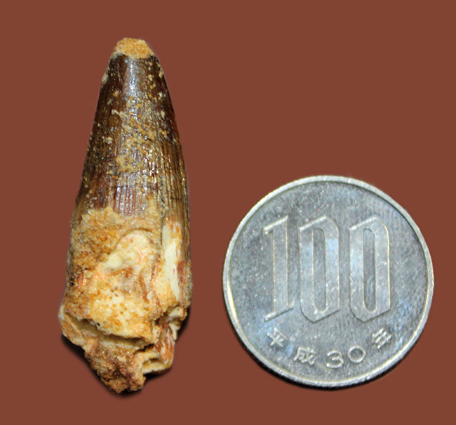 小ぶりながら、表面の縦溝などの特徴がよく現れた、モロッコ産スピノサウルスの歯化石をご紹介します。