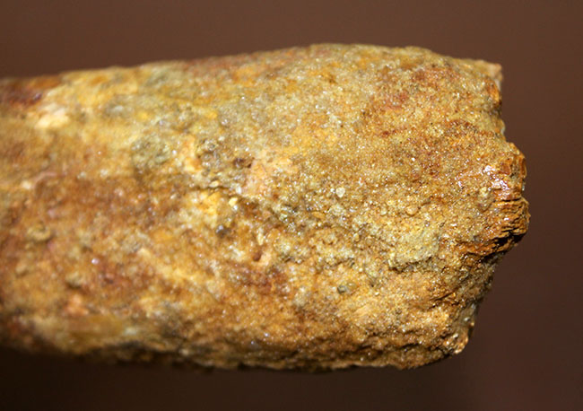 横に添えてあるのは同じスピノサウルスの35ミリ級の歯化石です。長さだけで比べるとわずか4倍の違いですが、目を通して感じる迫力には雲泥の違いがあることがお分かりでしょうか。この歯化石の前では、10センチ級の巨大歯化石でさえも、子供の歯化石のように見えるでしょう。それほど巨大な歯化石なのです。
