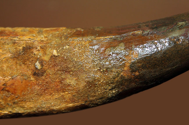 非常に美しく巨大な歯化石ですが、この歯根の迫力は見逃せません。写真では分からない、圧倒的な存在感があります。スピノサウルスがいかに強力で恐ろしいプレデター(捕食者)であったのか、この歯根が表しています。