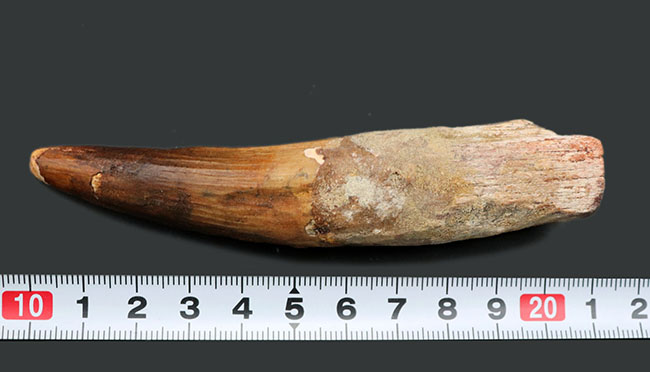 | 学名 | 歯根が残存しているタイプ、長辺計測で11センチを超える立派なスピノサウルス(Spinosaurus)の歯化石 |